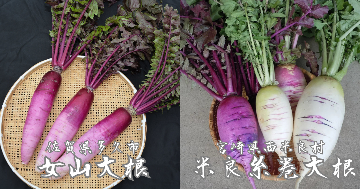 日本各地には、その土地の風土と暮らしに根差した「在来野菜」があります。その中でも、色・形・風味で人々を惹きつけるのが、佐賀県多久市西多久町の女山大根(おんなやまだいこん)と、宮崎県西米良村の米良糸巻大根(めらいとまきだいこん)です。