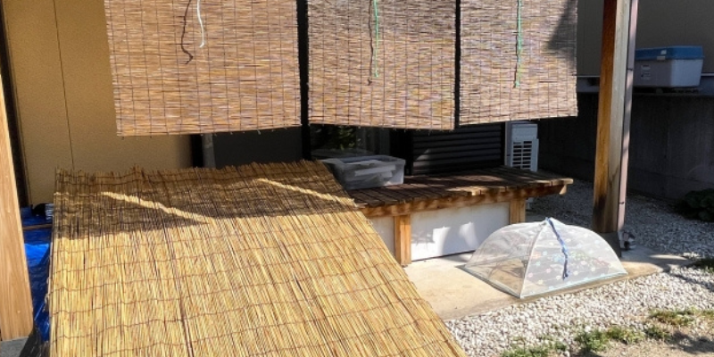 ※葦簀~葦の糸を編んで作られた、日よけや目隠しに使う大型の簾(すだれ)の一種