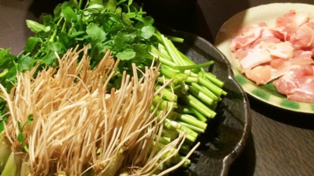 - 食べる直前にせりの根→茎→葉の順で入れる(せりを切り分けるときに根・茎・葉に分けておくと良し。葉と茎は水につけ置き、根はよく洗って使用します。)