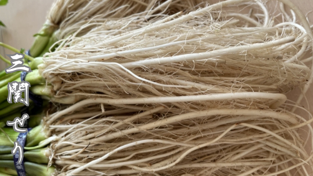 三関せりは、白く長く伸びた根と野性味あふれる強い香りが魅力。
